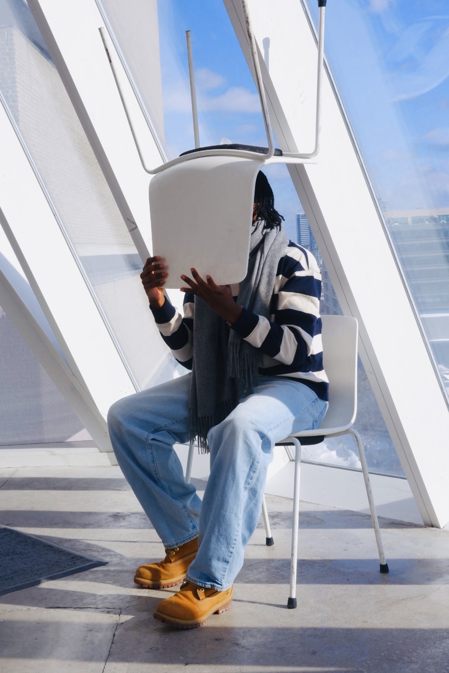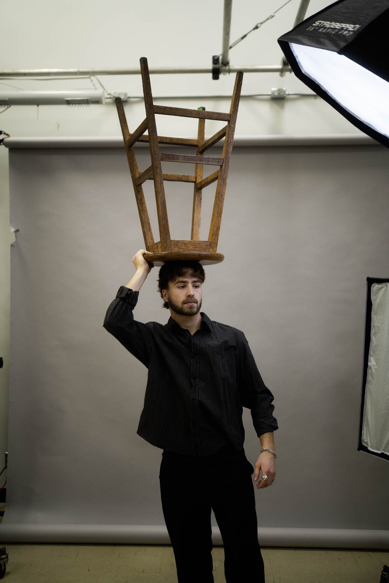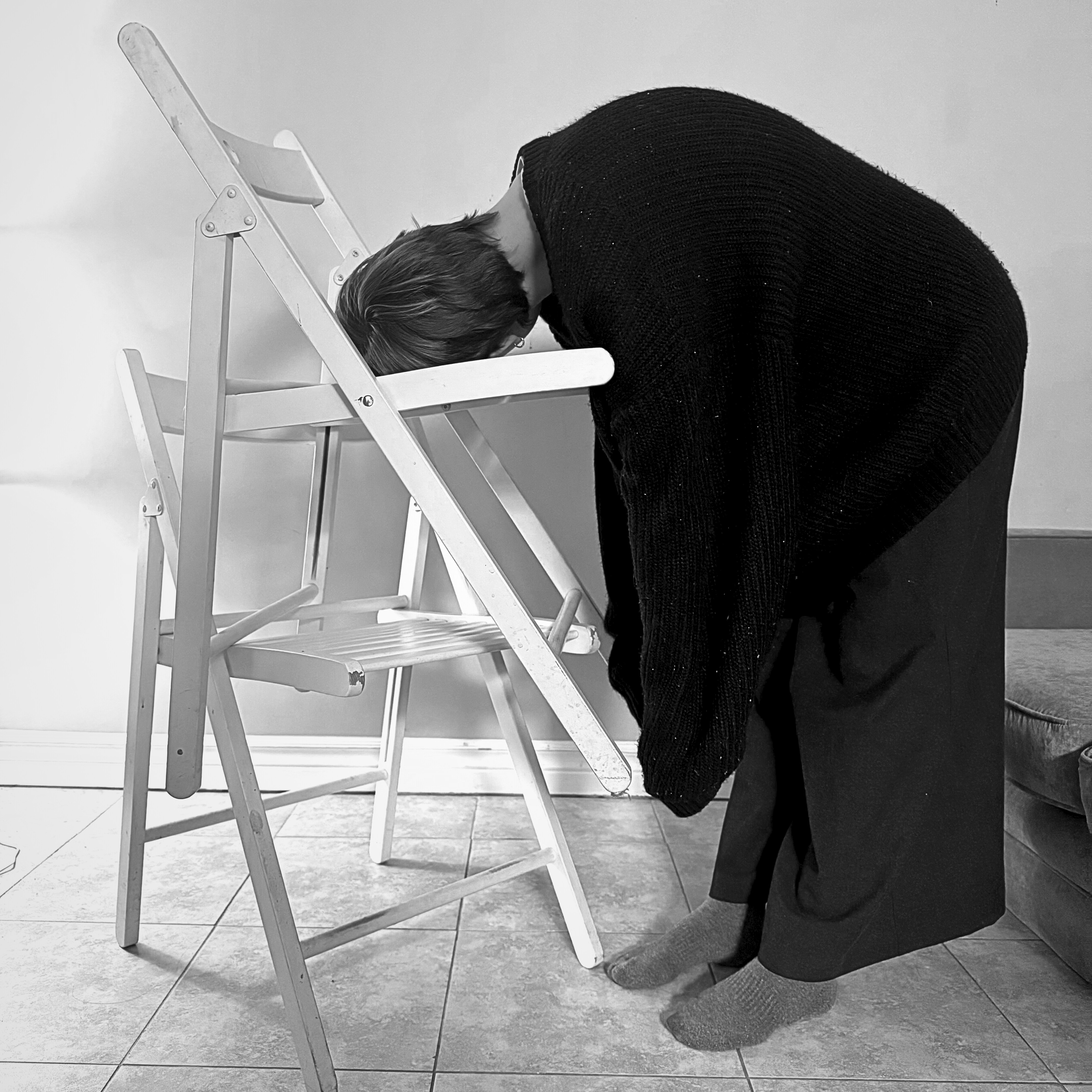 In Éric Chevillard's novel Au Plafond (On the Ceiling), the main character wears a chair upside-down on his head - both an absurdist gesture and a creative horizon from which the story itself unfolds. What is particularly noteworthy about this is how, in the hands of Chevillard, the act of wearing a chair upside down on one's head can be seamlessly integrated into an otherwise unremarkable narrative, without losing its creative edge or sense of humor. This project is an homage to this character in Chevillard's story, expanded into the real world of photographic practice as a documentary of everyday life made to act - for a moment - in ways that might otherwise be inconceivable.