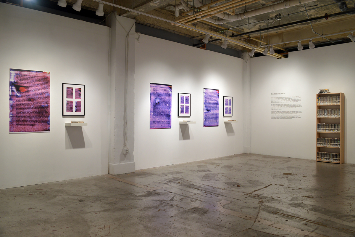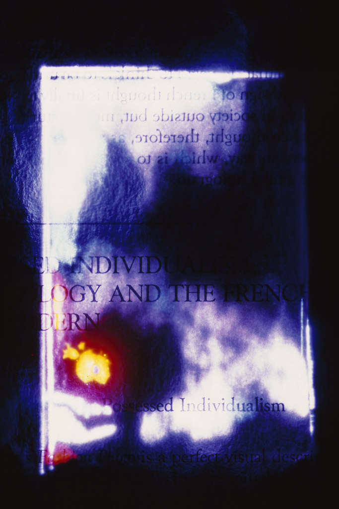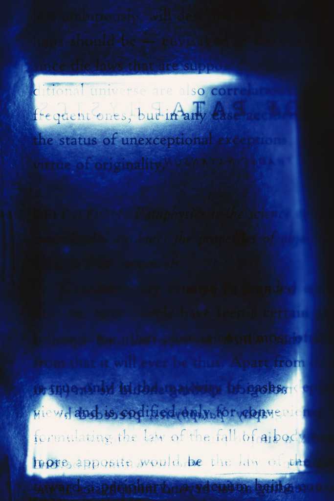 For several years, I have been collecting copies of used books that contain Jorge Luis Borge's short story "The Library of Babel," a story about a library of infinite knowledge - a library so large and comprehensive that it contains a copy of every book ever written, every book that could be written - every possible combination of letters and numbers and languages. But what such a library could never include is the way in which a book changes by being read - the ways that the touch of the reader interacts with, and influences, the text itself. Using Kirlian photography - an electricity-based imaging technique - this project aims to reveal the hidden experiential history of the book. Any mark on the text that effects the conductivity of the electrical current should make a difference to the way the image appears - fingerprints, marks or underlines, coffee stains or other signs of wear and tear left by the owners and readers of the story.