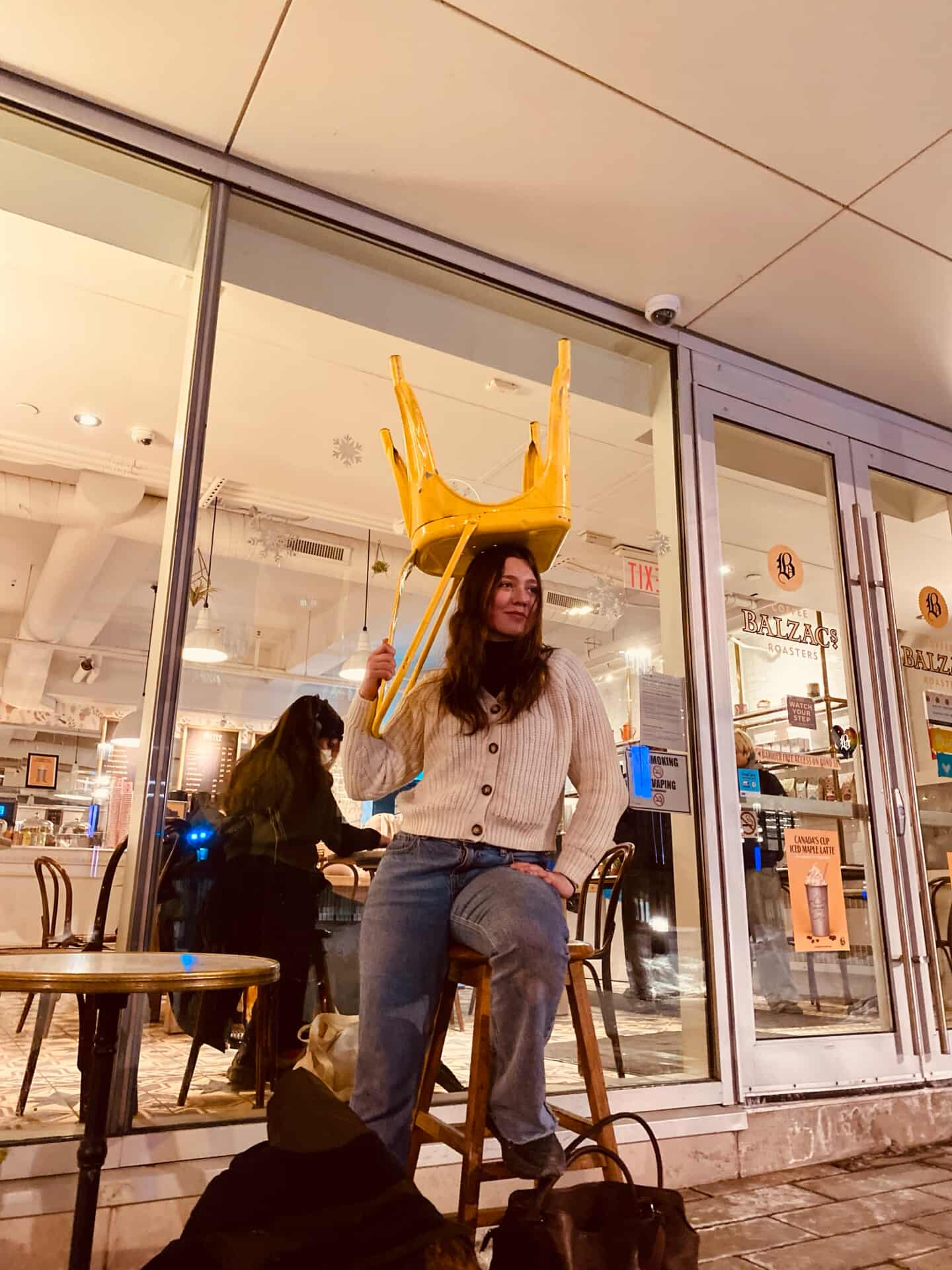 Prompt for participants: Take a picture of someone wearing a chair on their head.