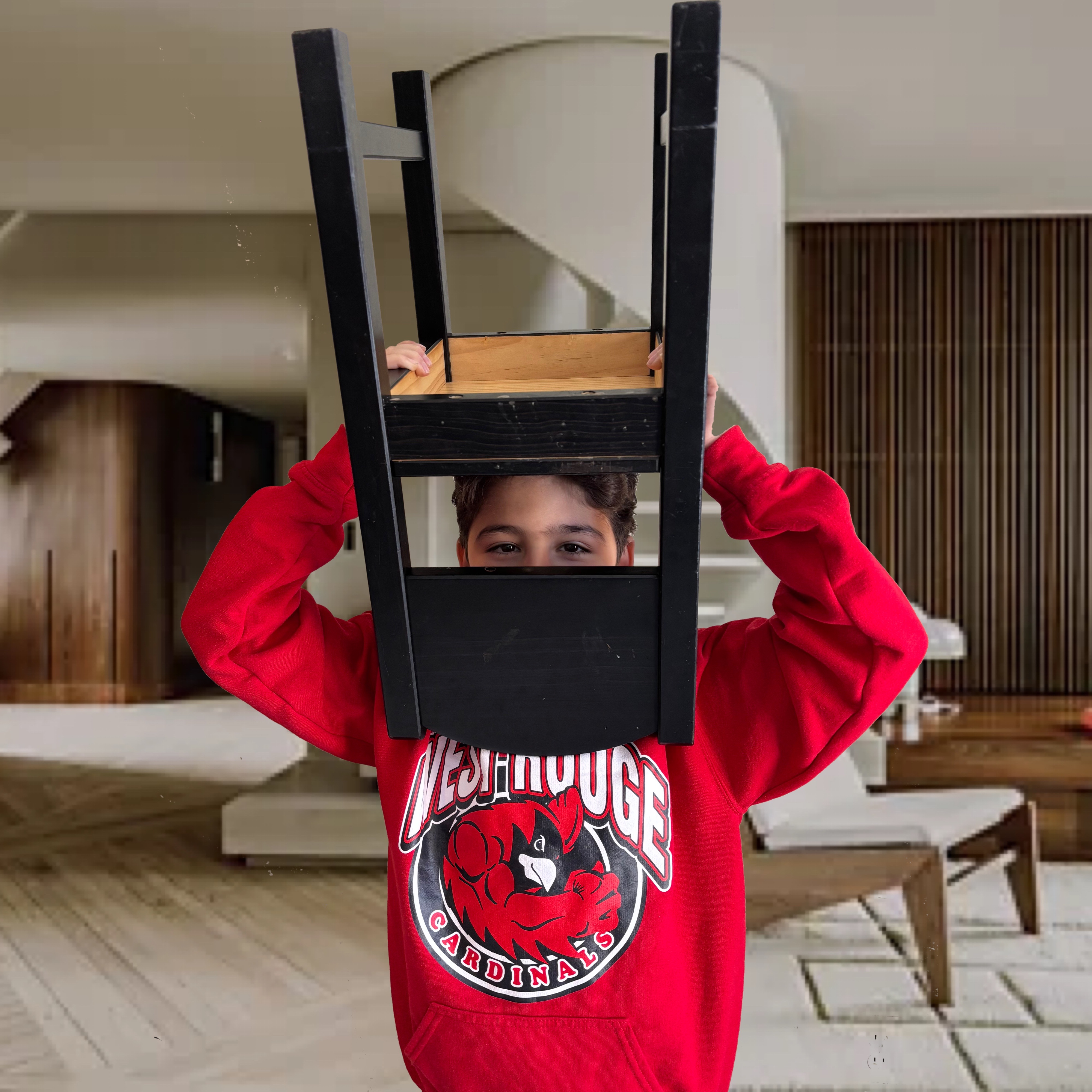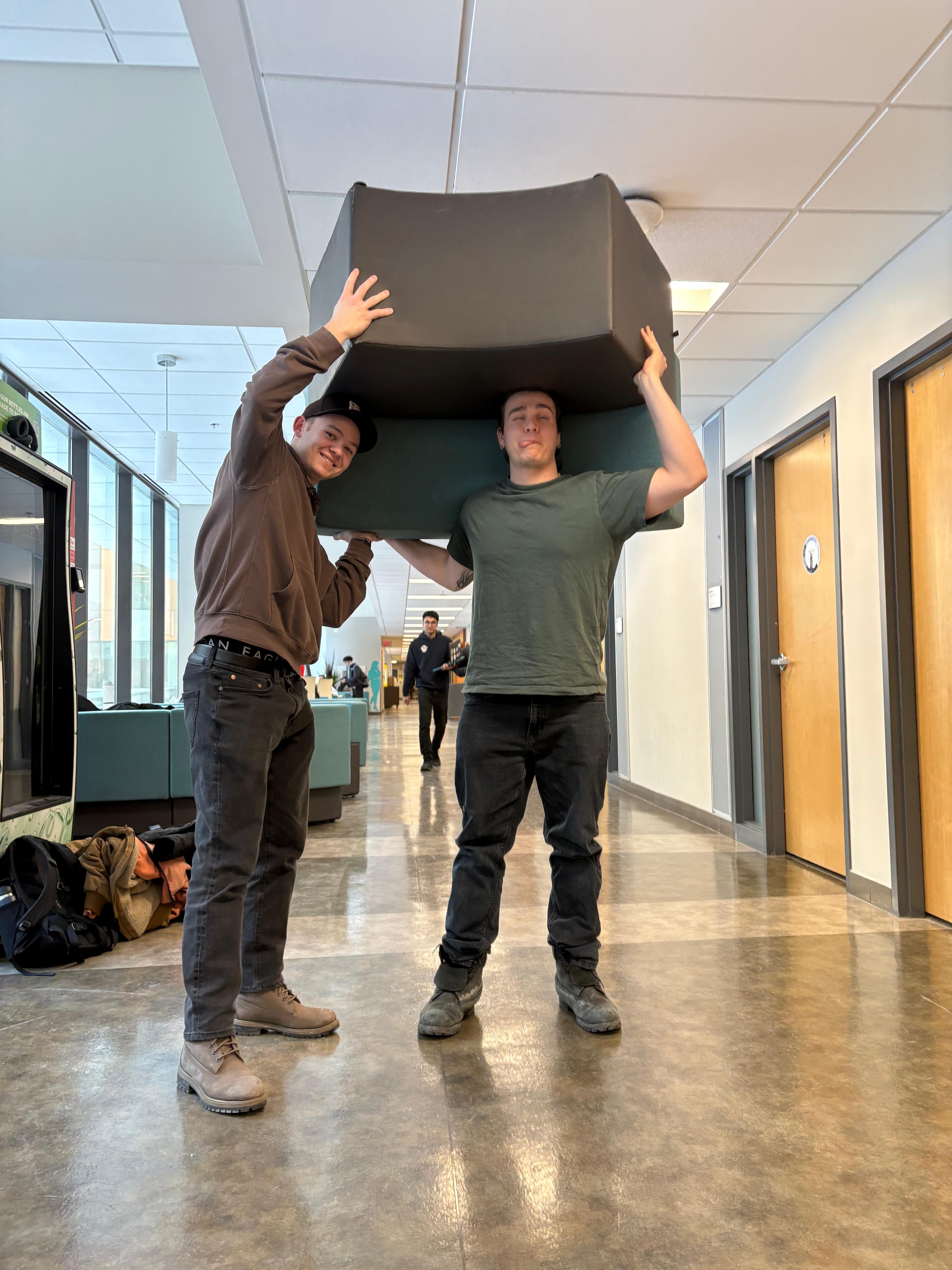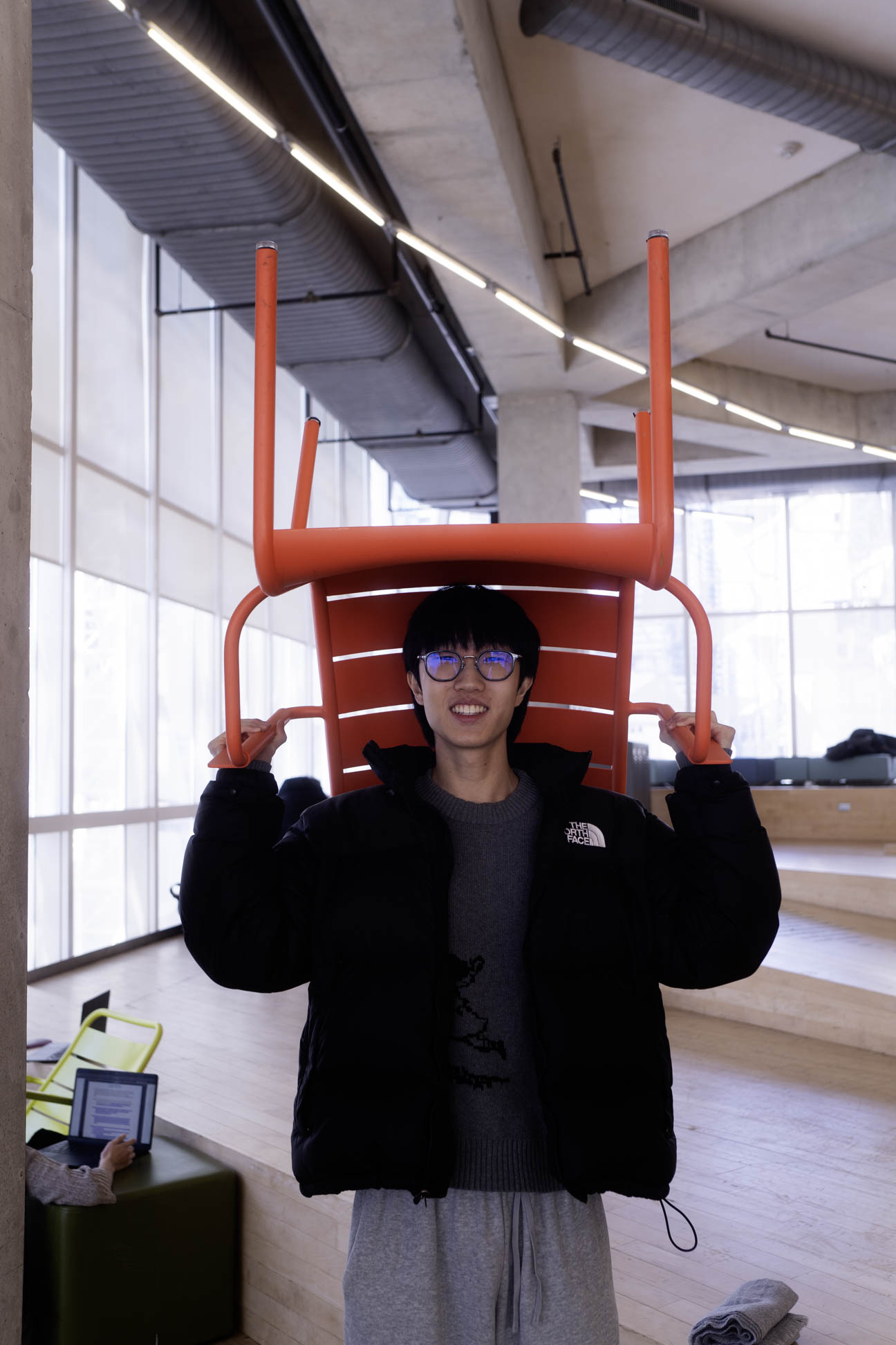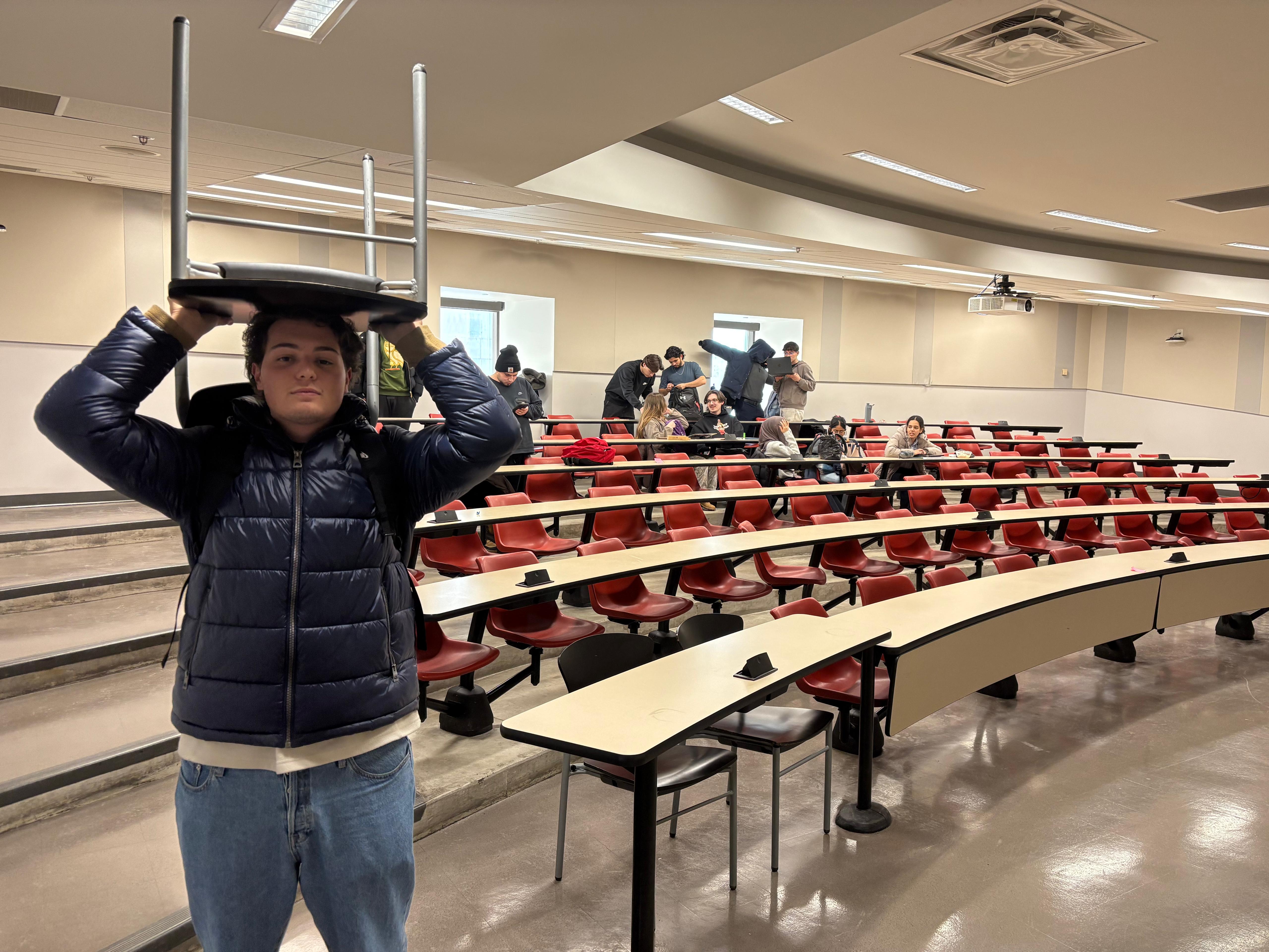 Prompt for participants: Take a picture of someone wearing a chair on their head.